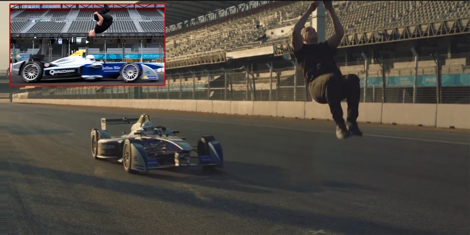 Zum einen konnte Walters das von hinten heranrasende Formel-E-Auto nicht sehen, zum anderen machte er nicht einen normalen Sprung über das Fahrzeug, sondern entschied sich für einen Backflip (Rückwärtssalto). Der Fahrer beschleunigte sein Fahrzeug auf der Start-Ziel-Geraden einer Rennstrecke auf exakt 100 km/h. Wäre Walters nur einen Augenblick zu spät weggesprungen, hätte ihn das Formel-E-Fahrzeug überfahren. Nach einigen Übungsversuchen (nebeneinander) wurde die Aktion durchgezogen. Doch sehen Sie selbst: