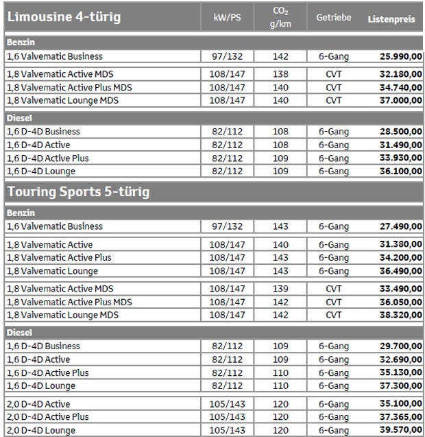 Dabei zeigt sich, dass die Einstiegspreise in die Avensis-Welt trotz deutlich besserer Serienausstattung und hochwertigerem Innenraum nahezu unverändert bleiben. Die Limousine mit dem 1,6 Valvematic beginnt bei 25.990 Euro und der Touring Sports ist mit dem 1,6 Valvematic ab 27.490 Euro erhältlich. Neben dem Komfort wird vor allem die Sicherheit groß geschrieben: In der Einstiegsvariante Business ist bereits das Toyota Safety Sense System mit integriertem Pre-Collision System mit an Bord. Ab der Ausstattungslinie Active kommen noch das automatische Fernlichtsystem, der Spurwechselwarner und der Verkehrszeichen-Assistent serienmäßig hinzu. Noch besser sind die Active Plus- und Lounge-Modelle ausgestattet. Neben zwei Saug-Benzinern (1,4- und 1,8l-Valvetec) gibt es zwei neue, von BMW zugekaufte Turbo-Diesel (1,6D-4D und 2,0D-4D), die in Österreich produziert werden.