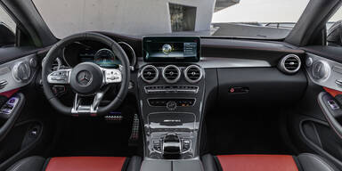 Im Interieur setzt sich der sportliche Eindruck fort. Serienmäßig ist die Ausstattung mit schwarzen Sitzbezügen in Ledernachbildung. Optional gibt es auch feines Nappaleder. Neu sind für alle vier Karosserievarianten als Option die Zierelemente Holz Eiche anthrazit offenporig, Holz Walnuss offenporig sowie die Kombination aus Aluminium für die Türen und Holz Esche schwarz offenporig für die Mittelkonsole. Weiterhin erhältlich sind Zierelemente in Carbon/Aluminium oder in Glasfaser. Das seit dem Facelift bei den normalen Modellen erhältliche virtuelle Cockpit mit 12,3 Zoll Display ist beim C63 (leider) auch nur gegen Aufpreis mit an Bord. Hier können sich die Kunden für einen von drei AMG-spezifischen Anzeigestile („Klassisch“, „Sportlich“ oder „Supersport“) entscheiden. Über das AMG Menü kann der Fahrer zudem zahlreiche Zusatzinformationen abrufen. Die Bedienmöglichkeiten wurden erweitert. Die Steuerung erfolgt nun über Touchpad und Controller, Touch Control Buttons am neuen Lenkrad oder per Spracheingabe.