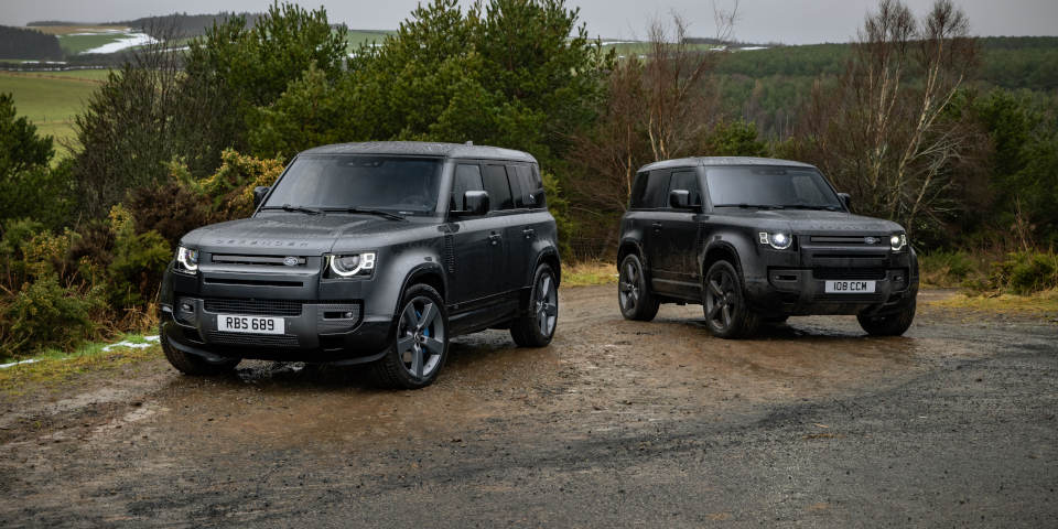 Fans der Marke werden den Defender V8 auch von außen sofort erkennen. Zu den eigenständigen Merkmalen zählen spezielle Modellembleme, eine Vierfach-Abgasanlage, satin-graue 22-Zoll-Leichtmetallfelgen sowie blaue vordere Bremssättel und 20-Zoll-Bremsscheiben. Als Außenfarben stehen zur Carpathian Grey, Yulong White und Santorini Black Wahl. Bei den grauen und weißen Lacken kommt das schwarz lackierte Dach besonders gut zur Geltung. Diverse dunkle Karosseriedetails runden die eigenständige Optik des V8-Modells ab.