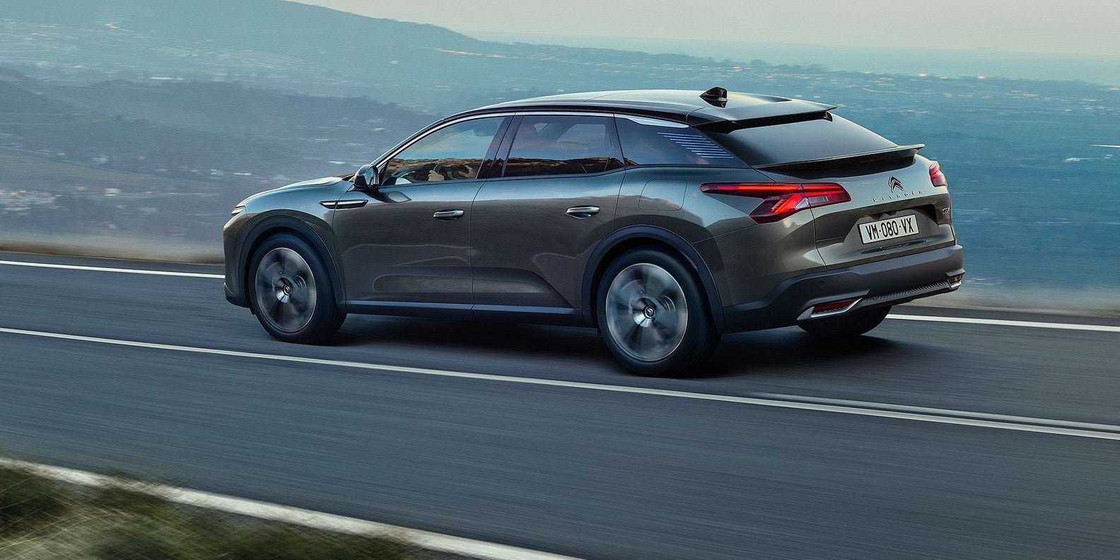 Optisch ist der 4,80 m lange, 1,86 m breite und 1,48 m hohe C5 X auf den ersten Blick als Citroen zu erkennen. Die Front weist Designelemente des neuen C4 auf, am Heck schimmert der C5 Aircross etwas durch. Darüber hinaus sind auch einige Parallelen zur 2016er-Studie CXperience Concept erkennbar. In der Silhouette werden Eigenschaften von Limousine und Kombi mit SUV-Attributen kombiniert. In den ausgestellten Radhäusern sitzen mindestens 19 Zoll große Felgen. Der Radstand von 2,78 m verspricht ein üppiges Platzangebot. Der von 495 auf bis zu 1.580 Liter erweiterbare Kofferraum wird über eine breite Heckklappe beladen. Die neue LED-Lichtsignatur in V-Form an Front und Heck wirkt ziemlich modern.
