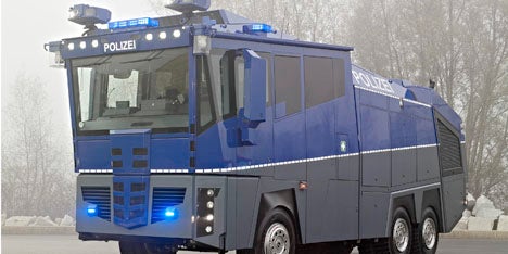 Seit Kurzem wird das erste blau und grau lackierte Ungetüm mit grimmigem Design von deutschen Polizisten getestet. Das 400-PS-Monster trägt einen 10.000-Liter-Wassertank und ist ein Hightechprodukt – ausgerüstet auch mit Kameras zum Aufzeichnen der Einsätze. Läuft der Test positiv, will das deutsche Innenministerium bis zu 78 Fahrzeuge ordern. Stückpreis: fast 1 Mio. Euro.