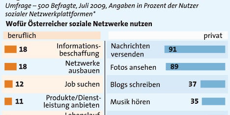 Bereits 59 % der Österreicher nutzen soziale Netzwerke im Internet. Bei 18 % kommen die Dienste auch beruflich zum Einsatz, ergibt eine in Wien präsentierte Online-Umfrage von marketmind im Auftrag der Mobilkom Austria. 7 von 10 Österreichern haben allerdings massive Bedenken hinsichtlich Datenschutz und fürchten sich vor dem Ausspioniert-Werden.
