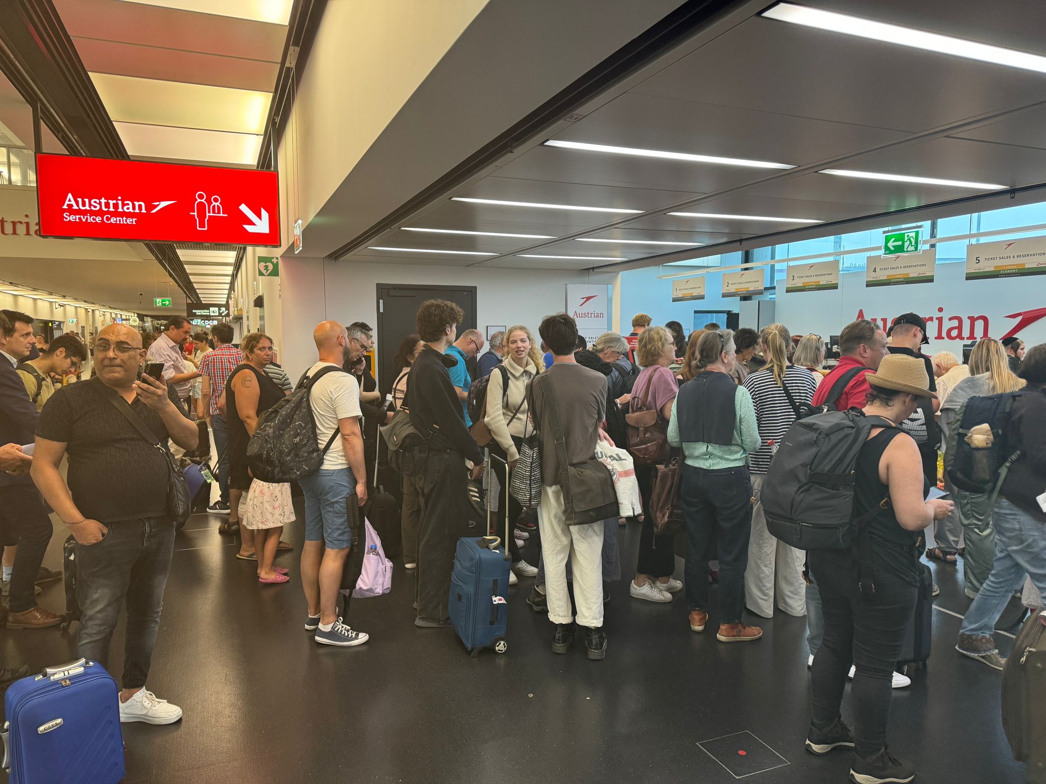Am Flughafen Wien-Schwechat strandeten am Freitag viele AUA-Passagiere stundenlang. Manche warten seit 12 Stunden auf ihren Flug.