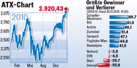 Das Jahr 2010 war ein Rekordjahr für die Wiener Börse, mit einem Kursplus von rund 17% beim Leitindex ATX. Damit wurde etwa der deutsche Leitindex DAX (16-%-Plus) übertroffen. Zunächst hatte es gar nicht gut ausgesehen, denn der ATX, der am 4. Jänner 2010 mit 2.509,27 Punkten startete, pendelte lange unentschlossen, im Sommer ging es durch die Schuldenkrise zweimal bis in die Gegend von 2.200 hinunter. Doch dann wendete sich das Blatt, seit September geht es fast ununterbrochen aufwärts, zuletzt über 2.920 Punkte. "Ich bin mit dem Börsenjahr 2010 sehr zufrieden“, sagt Börsenvorstand Heinrich Schaller. "Die gelisteten Unternehmen sind nach dem Krisenjahr 2009 wieder auf Wachstumspfad, was sich auch in der Entwicklung unseres Leitindexes ATX widerspiegelt.“