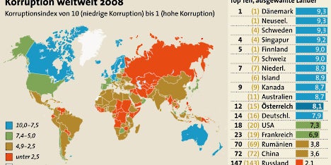 Am niedrigsten ist die Korruption demnach in Dänemark, Neuseeland und Schweden (ex aequo 9,3 Punkte), am höchsten in Somalia (1,0 Punkte). TI erstellt seine Korruptionsindex aufgrund von Befragungen unter Geschäftsleuten und Beobachtern, die in den jeweiligen Ländern tätig sind. Er bezieht sich auf die Verbreitung von Korruption unter Politikern und öffentlich Bediensteten.