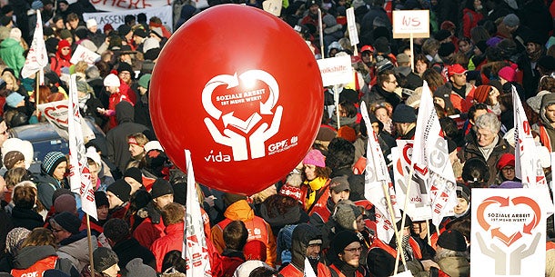Tausende Beschäftigte im Gesundheits- und Sozialbereich sind am Mittwoch in Wien, Linz, Graz und Klagenfurt bei klirrender Kälte für höhere Löhne und Gehälter auf die Straße gegangen. Allein in der Bundeshauptstadt demonstrierten - nach Polizei- bzw. Veranstalterangaben - 2.000 bis 3.000 Menschen, in Linz mehr als 1.000. Unter dem Motto "Soziale Arbeit ist mehr Wert!" verlangten die Kundgebungsteilnehmer in Wien ein Kollektivvertrags-Plus von 4,1 Prozent.
