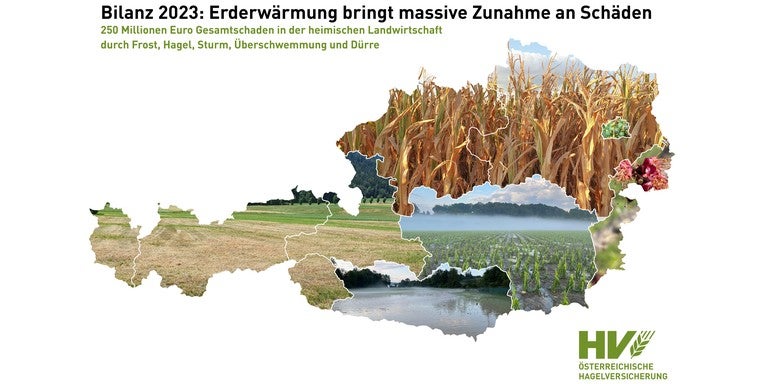 Die erste Jahreshälfte war für die heimische Landwirtschaft sehr herausfordernd: Einem verfrühten Vegetationsbeginn durch einen milden März folgte ein relativ kühler April. Die Folge des Temperatursturzes Anfang April waren schwere Frostschäden an Obstkulturen in der Höhe von 35 Millionen Euro, insbesondere in der Steiermark. Sehr niederschlagsintensive Wochen, vor allem im Osten und Süden Österreichs, führten sowohl im April als auch im Juli zu schweren Überschwemmungen. Ebenso kam es zu Hagel- und Sturmschäden an landwirtschaftlichen Kulturen. In Summe entstand durch diese Wetterextreme ein Schaden von 45 Millionen Euro an landwirtschaftlichen Kulturen. Das dominierende Thema war aber in den Sommermonaten die extreme Dürre, vor allem im Norden und Westen Österreichs. So folgten dem siebent wärmsten Sommer der Messgeschichte der heißeste September und Oktober seit Beginn der Aufzeichnungen. In Summe entstand durch den fehlenden Niederschlag und durch eine Vielzahl an Tagen mit Temperaturen jenseits der 30 °C ein Dürreschaden von 170 Millionen Euro, unter anderem an Maiskulturen und dem Grünland. Der November war einer der fünf niederschlagsreichsten November der Messgeschichte, im Dezember war vor allem der Sturm das dominierende Thema. Insgesamt entstand somit in der Landwirtschaft im Jahr 2023 ein Gesamtschaden von 250 Millionen Euro.