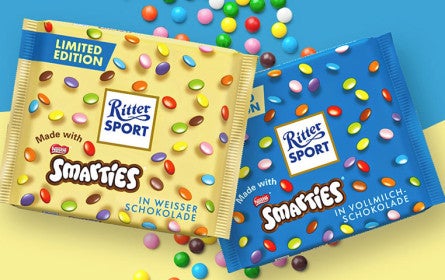 Schokofans können sich freuen, denn das traditionsreiche Familienunternehmen Ritter Sport bringt imHerbst erneut die begehrte Sortenkombination aus Schokolade und bunten Smarties-Schokolinsen in die Regale.