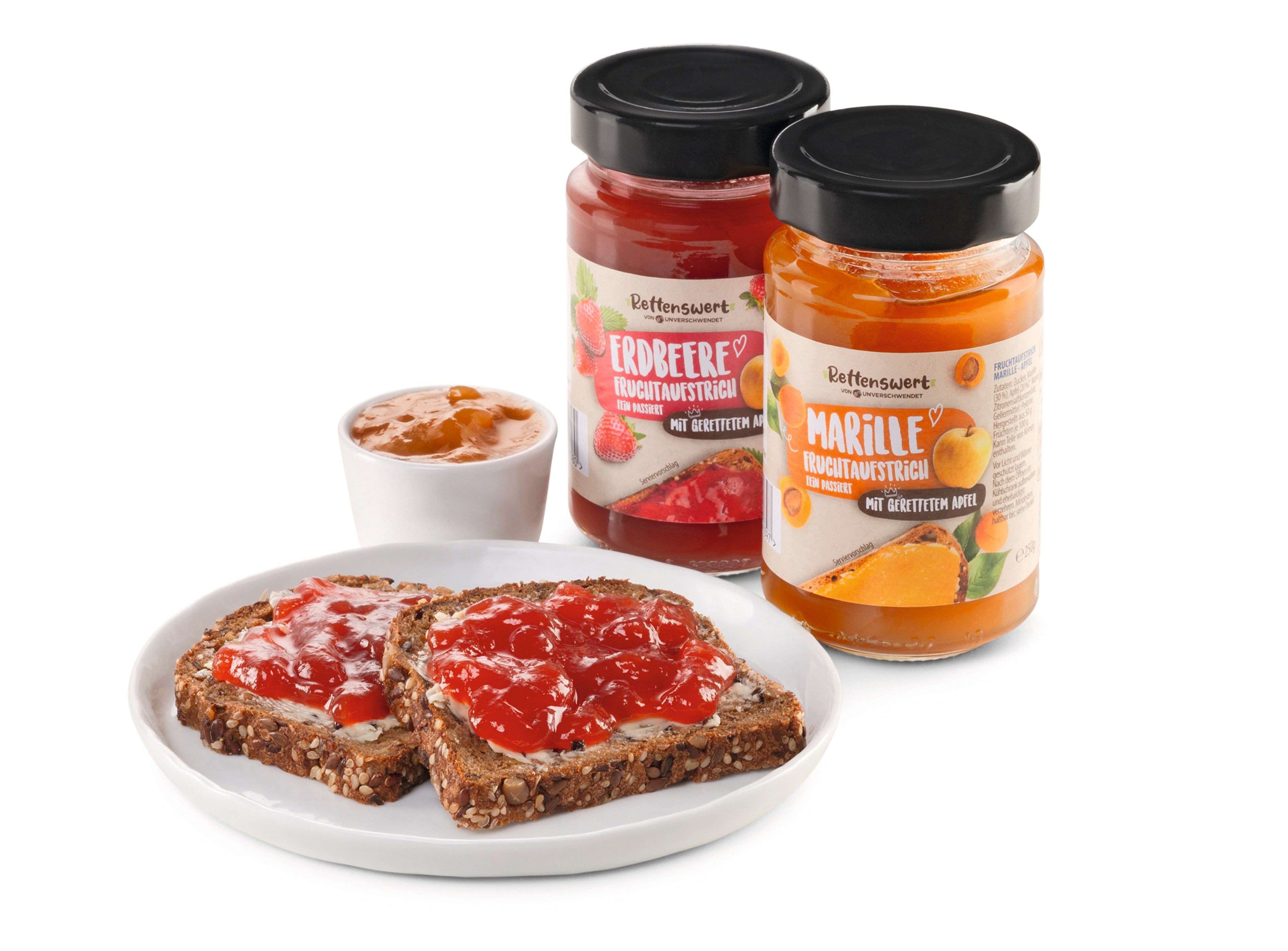 • Apfelmus, 350 g – € 1,29• Konfitüre, Apfel-Marille oder Apfel-Erdbeere, 250 g – € 1,99• Zimtfrühstück, aus geretteten Kichererbsen, 100 g – € 1,49• Pesto, Paprika Cashew, Karotte oder Rosso Mandel, 180 g – € 1,99• Sugo, Karotte-Tomate oder Karotte-Tomate-Linse, 350 g – € 1,99• Fertiggericht, Kartoffelgulasch oder Bohneneintopf, 400 g – € 1,89• Gurkenhappen, 670 g – € 1,49• Aufstrich, Tomate-Basilikum oder Süßkartoffel, 180 g – € 1,79 (dauerhaft erhältlich)•