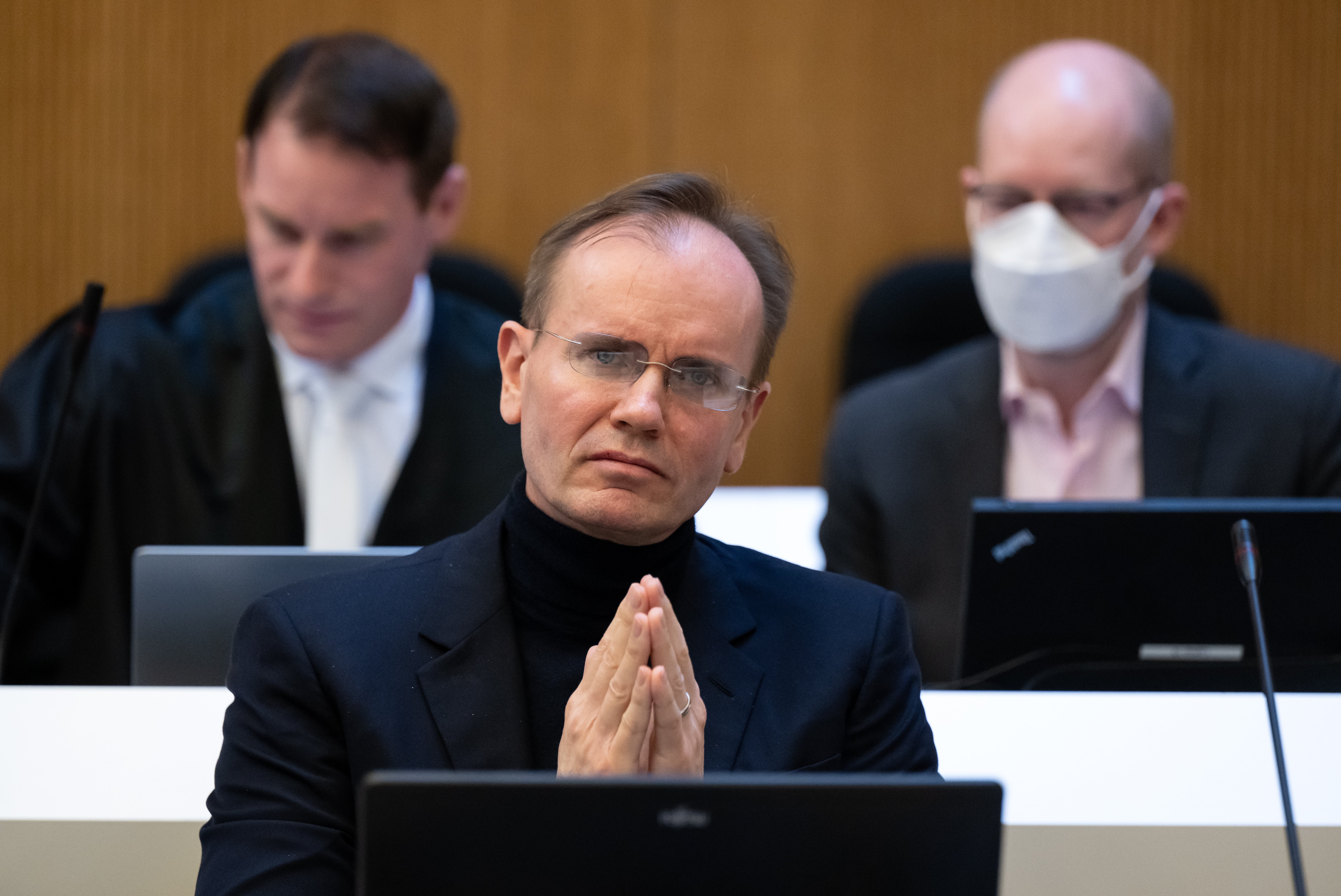 Der frühere Wirecard-Vorstandschef Markus Braun (M) sitzt vor Beginn der Fortsetzung im Wirecard-Prozess auf seinem Platz im Gerichtssaal. Im Hintergrund rechts sitzt der Mitangeklagte im Wirecard-Prozess, Oliver Bellenhaus mit seinem Anwalt Florian Eder (l).