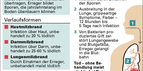 Die Infektion mit Milzbrand-Sporen erfolgt auf drei Arten: Bakterien dringen über Verletzungen der Haut ein und verursachen den sogenannten Hautmilzbrand, die häufigste und harmloseste Variante, bei der eine Nekrose von der Größe einer Zwei-Euro-Münze entsteht.