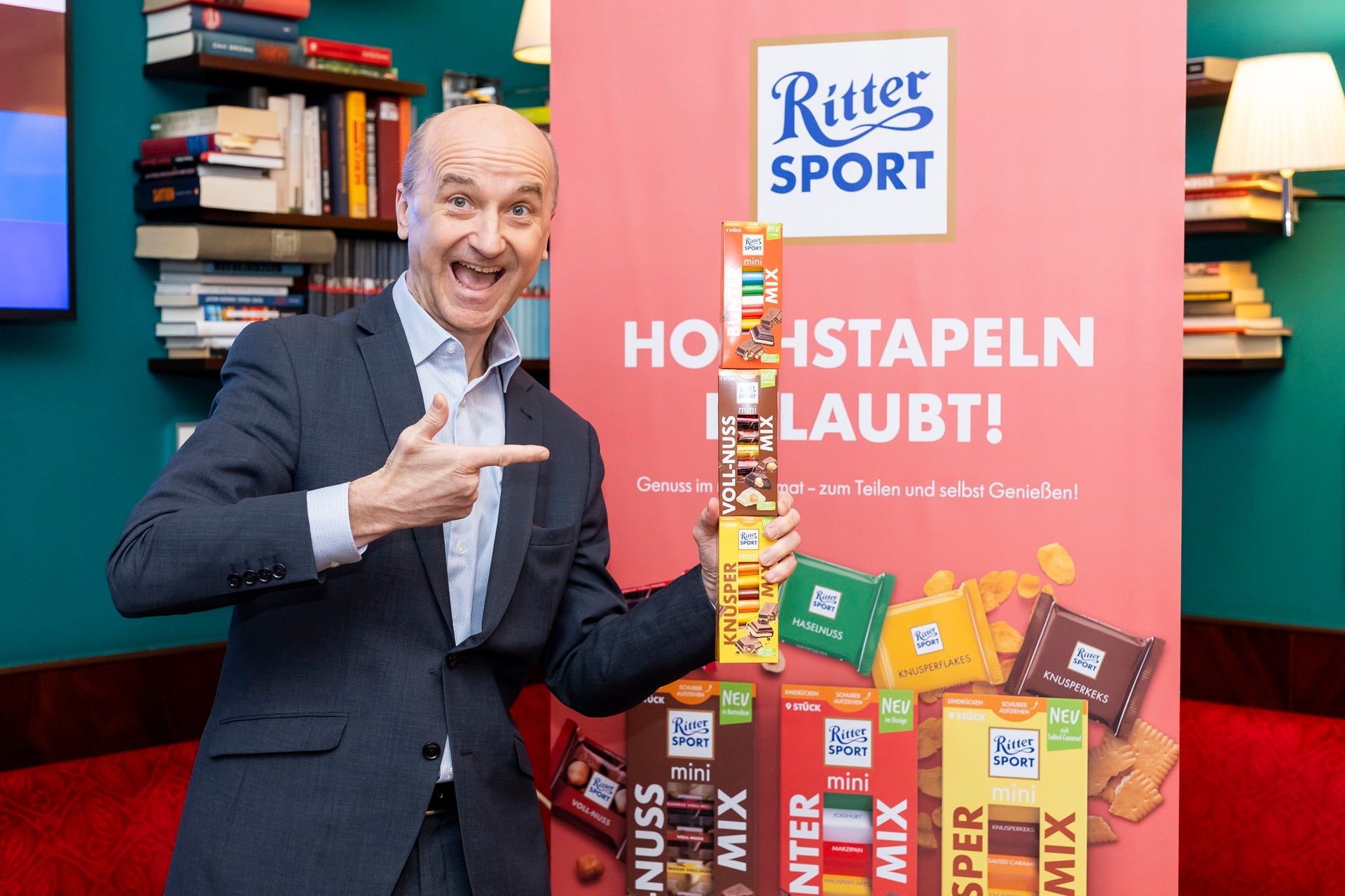 Wolfgang Stöhr, Geschäftsführer RITTER SPORT Österreich mit den neuen RITTER SPORT mini-Türmen