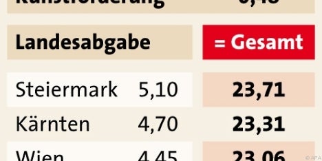 In der Steiermark ist die Landesabgabe mit 5,10 Euro am höchsten. Verwendet wird sie laut dem Landesgesetz für Zwecke der Öffentlichkeitsarbeit, für kulturelle Aufwendungen und die Sportförderung. In Kärnten wird eine Rundfunkgebühr von 23,31 eingehoben, die Landesabgabe beläuft sich auf 4,70 Euro. Mit diesem Geld werden vom Land die Musikschulen gefördert.