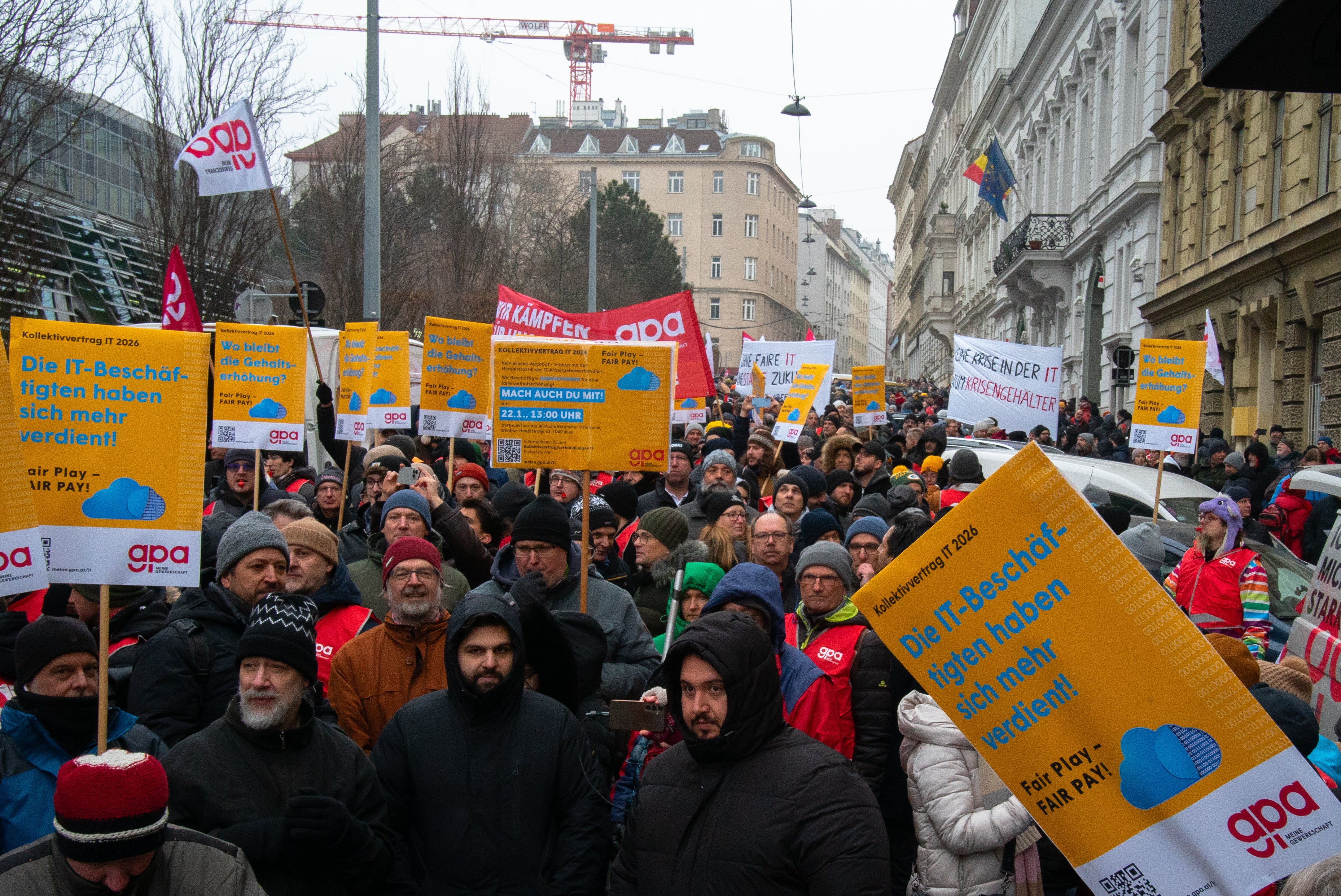 Gehaltsstreit in der IT-Branche. Die Gewerkschaft GPA erhöht Druck vor fünfter Verhandlungsrunde. Tausende protestierten am Donnerstag in Wien.