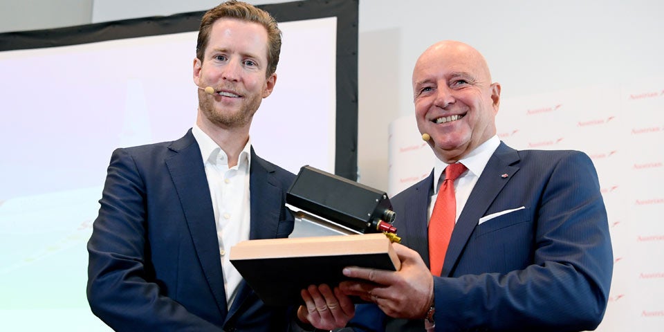 Der zukünftige Austrian Airlines (AUA)-Vorstandsvorsitzende Alexis von Hoensbroech (links) wurde am Dienstag, 31. Juli 2018, im Rahmen einer Pressekonferenz zum Thema "Ergebnis 1. Halbjahr - Staffelübergabe CEO" am Flughafen Schwechat, offiziell vorgestellt. Noch AUA-Boss Kay Kratky (rechts) übergab seinem Nachfolger, der am 1. August seinen neuen Posten offiziell antritt, das Zepter.