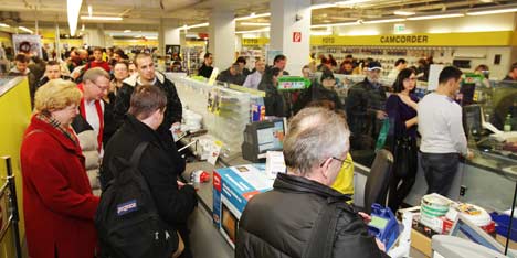 Nach dem Konkurs der Elektrohandelskette Cosmos startete gestern die Schnäppchenjagd im Abverkauf. Viele Regale sind bereits leer