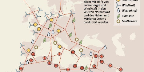 Die Vision von umweltfreundlichem Solarstrom aus der Wüste ist einen Schritt näher gerückt. Zwölf Unternehmen haben am Montag (13. Juli) in München die Grundsatzvereinbarung zur Gründung der Desertec Industrial Initiative unterzeichnet. Sie soll binnen drei Jahren konkrete Geschäftspläne und Finanzierungskonzepte erarbeiten, wie mit Sonnenkraftwerken in den Wüsten Nordafrikas und des Mittleren Ostens bis 2050 rund 15 Prozent des Europäischen Strombedarfs gedeckt werden können.