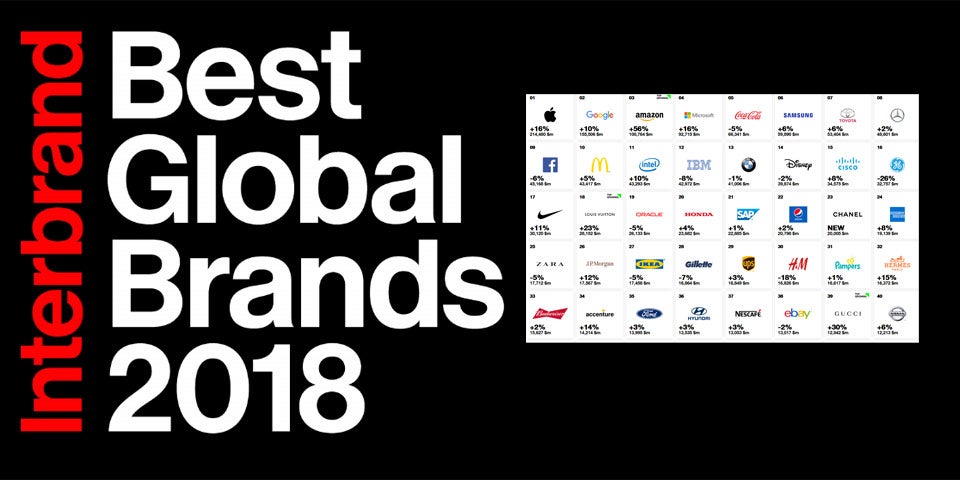 Interbrand hat am Donnerstag sein jährliches Top-100-Ranking der weltweit wertvollsten Marken veröffentlicht. Im mittlerweile 19. Jahr der Best Global Brands wurde erneut Apple zur wertvollsten Marke der Welt gekürt. Mit einem Markenwert von 214,48 Milliarden US-Dollar ist der iPhone-Konzern die erste Marke in der Geschichte der Best Global Brands, die die zwei hundert Milliarden US-Dollar Grenze knackt. Die neue Nummer drei heißt Amazon. Der Onlinehändler steigert seinen Markenwert um 56 Prozent. Damit verzeichnet Amazon das größte Wachstum aller Best Global Brands in diesem Jahr sowie das einer einzelnen Marke seit Facebook im Jahr 2014. Das spektakuläre Wachstum dieser Marke gründet auf ihrem Erfolg in der Neudefinition der Gesetze des Handels. Amazon ist führend in Bezug auf Benutzer- und Verbrauchererlebnis sowie Innovation und Reaktionsfähigkeit.