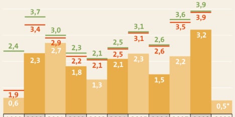 Vom Vorjahresergebnis werden die Metaller heuer aber nur träumen können. Damals einigten sich die Sozialpartner auf ein Plus von rund 3,9 % bei einer Inflationsrate von 3,2 %. Basis für die heurigen Verhandlungen sind eine Inflationsrate von 1,5 % (September 2008 bis September 2009) und die größte Wirtschaftskrise der Nachkriegszeit.