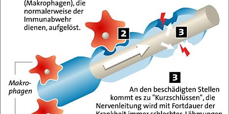 Schließlich begannen die T-Zellen erst nach dem Kontakt mit den Fresszellen entzündungsfördernde Botenstoffe auszuschütten und so den Angriff auf das Nervensystem einzuleiten. Als eine der Folgen durchquerten immer mehr T-Zellen die Wände der Blutgefäße. "Anscheinend ist die Aktivierung der T-Zellen an der Grenze zum Nervengewebe somit ein entscheidendes Signal für die Invasion der Immunzellen", folgerte Alexander Flügel, der Leiter der Studie.