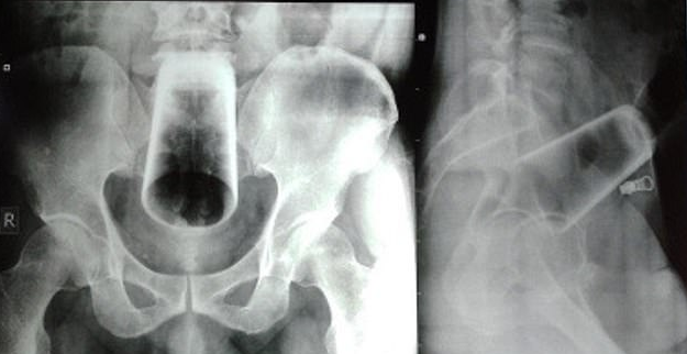 Bei der Untersuchung waren seine Stimmung und sein Verhaltensmuster "normal", und er hatte keine psychiatrischen Erkrankungen. Röntgenaufnahmen zeigten ein Wasserglas in umgekehrter Position im oberen Rektum und im Dickdarm. Die Ärzte lehnten eine Sigmoidoskopie ab - ein Verfahren, das es den Ärzten ermöglicht, mit Hilfe eines flexiblen Schlauches mit Licht in das Innere des Dickdarms zu schauen -, weil sie befürchteten, dass das Glas "beim Entfernen" zerbrechen würde.