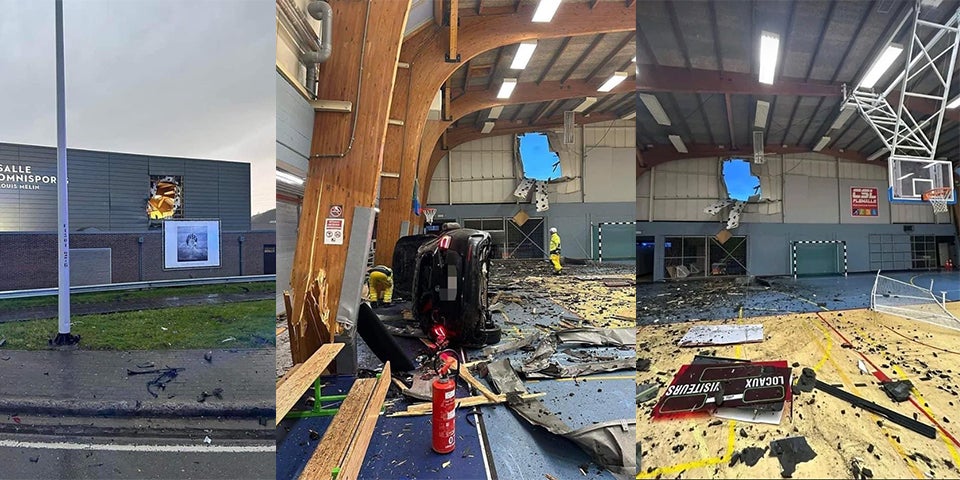 Kurioser Unfall eines Mercedes-Fahrers. Der Mann war viel zu schnell unterwegs und touchierte den Randstein an einem Kreisverkehr. Er hob wie ein Flugzeug ab und schlug in einer Basketballhalle ein.