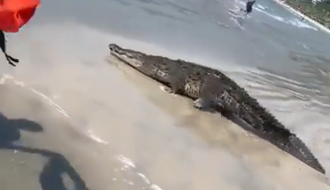 Der Clip enthüllt das ungewöhnliche Schauspiel: Das Reptil bahnt sich seinen Weg durch den Strand, während ein Rettungsschwimmer verzweifelt die Badegäste warnt. Einige Sonnenanbeter eilen eiligst aus dem Wasser, während das Krokodil gelassen seine Bahnen zieht.
