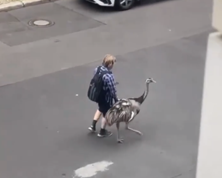 Ein unbekannter Mann geht mit einem Nandu unter anderem entlang des Brandenburger Tors und am Potsdamer Platz spazieren. Woher der Mann mit diesem Tier kam, ist bis jetzt unklar. Das Tier erinnert an den Emu "Emmanuel", der aufgrund seines Internet-Auftrittes zum Social-Media-Star wurde.