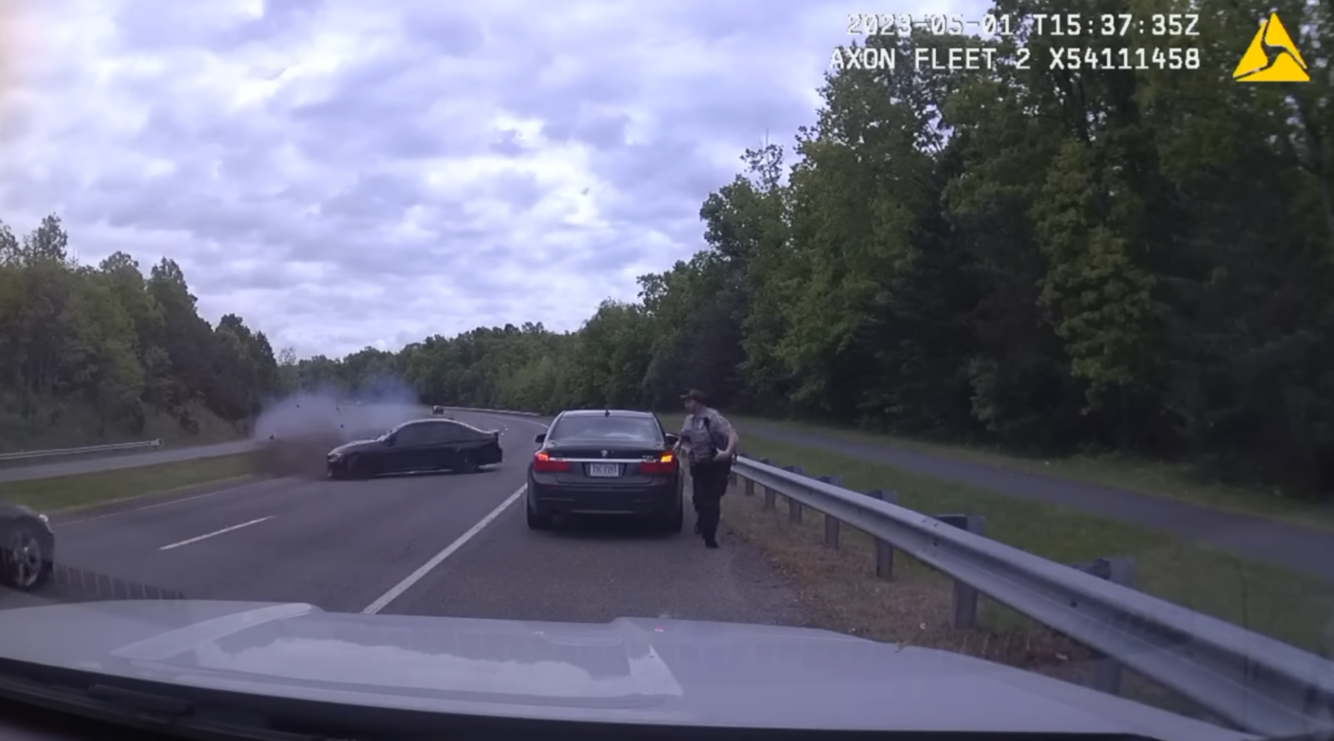 Einen wahren Horrorcrash wurde von einer Dashcam eines Polizeiautos eingefangen, als ein BMW mitten in eine laufende Polizeikontrolle crashte.