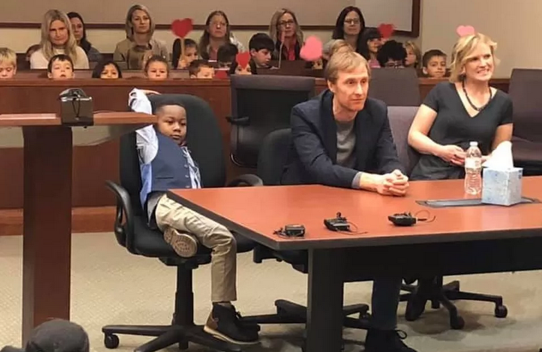 Ein fünfjähriger Junge aus Michigan hat seine gesamte Kindergartenklasse eingeladen, seiner rechtmäßigen Adoption beizuwohnen. Ein von Kent County auf Facebook veröffentlichtes Foto zeigt den kleinen Jungen, wie er es sich in einem Stuhl in Erwachsenengröße im Gerichtssaal neben seinen Adoptiveltern bequem macht.
