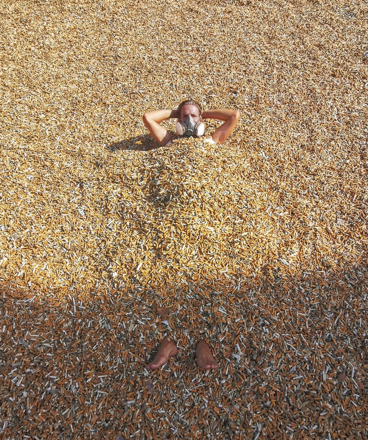 Ein Mann namens "The Trash Traveler" sammelte mit Hilfe von 600 Freiwilligen über 1,1 Millionen Zigarettenstummel ein und vergrub sich dann darin, bevor er sie ordnungsgemäß entsorgte.