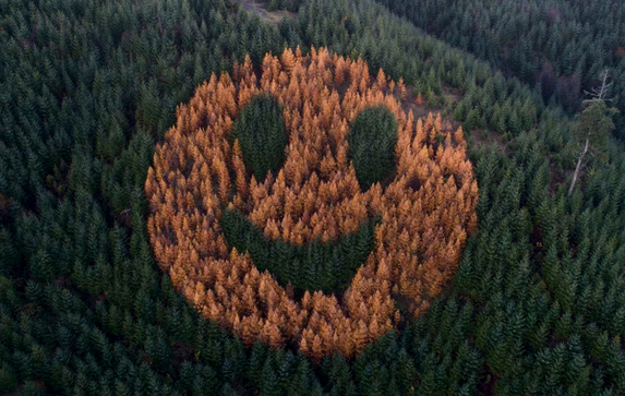 Während die Augen und der Mund mit Douglasien bepflanzt wurden, wurde das "Gelb" des Smileys durch das Pflanzen von Lärchenbäumen erzeugt.