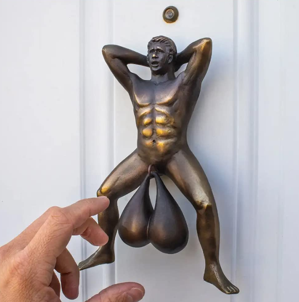 Bereits im zweiten Film der Reihe "Scary Movie" werden ähnliche "Doorballs" bereits präsentiert, nun gehen die eigenartigen Türklopfer in den Verkauf. Die "Bälle" dieses Mannes hängen greifbar tief nach unten, um einen guten Griff zu bekommen und anklopfen zu können. Es werden zwei unterschiedliche Größen verkauft, die kleine Version beläuft sich auf eine Größe von 22 Zentimeter.