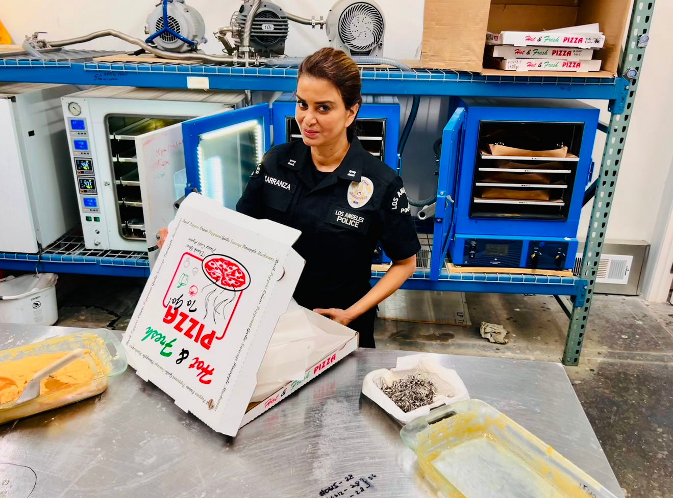 Laut Polizei handelt es sich bei der Einrichtung um eine Pizzeria , das in ein "Superlabor" umgewandelt wurde, um Honigöl, auch bekannt als Haschischöl oder Cannabisöl, zu extrahieren. Die Ermittler sagten, das Labor stelle eine ernsthafte Bedrohung für die umliegenden Unternehmen dar - einschließlich einer Tierklinik nebenan -, da Honigöl-Labore als gefährlich bekannt sind und manchmal Explosionen verursachen können.