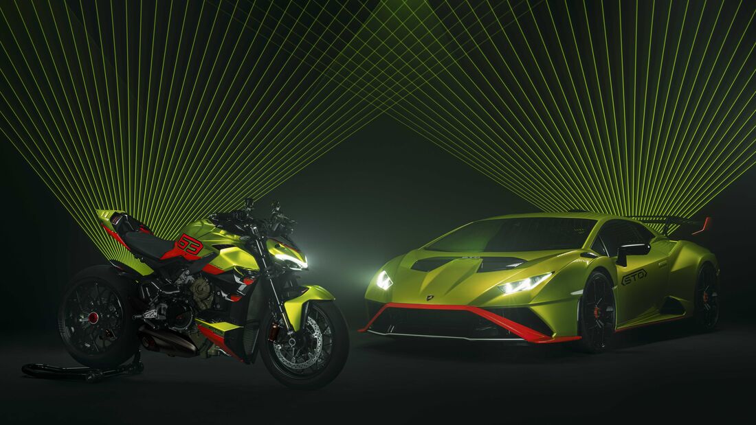 Als Hommage drehen die Ducati-Designer die V4 auf Links: Die Schmierräder sind ganz im Stile des Huracans, Kotflügel und Tankabdeckung sind umgestaltet worden. Neu interpretiert wurden auch Luftein und Auslässe.