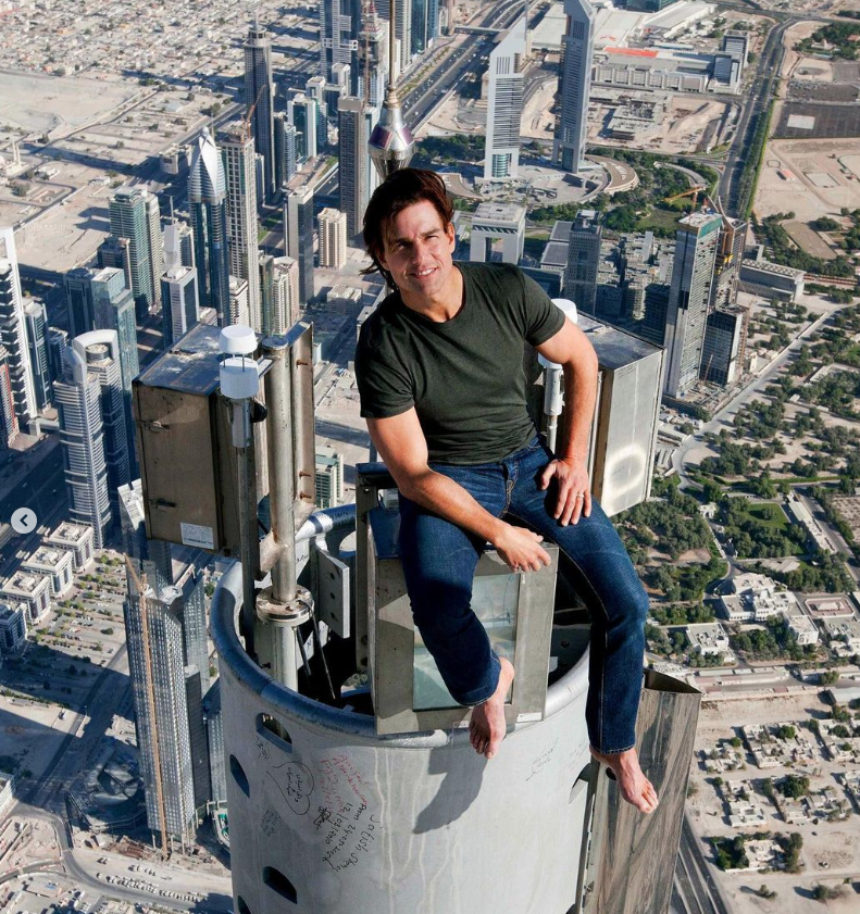 Es sieht wie ein Photoshop-Bild aus, soll aber tatsächlich real sein. Es soll zeigen, wie Tom Cruise auf dem Burj Khalifa sitzt. Und das ohne jegliche Sicherung. Das Foto soll im Rahmen der Dreharbeiten zu Mission Impossible Ghost Protocol entstanden sein.