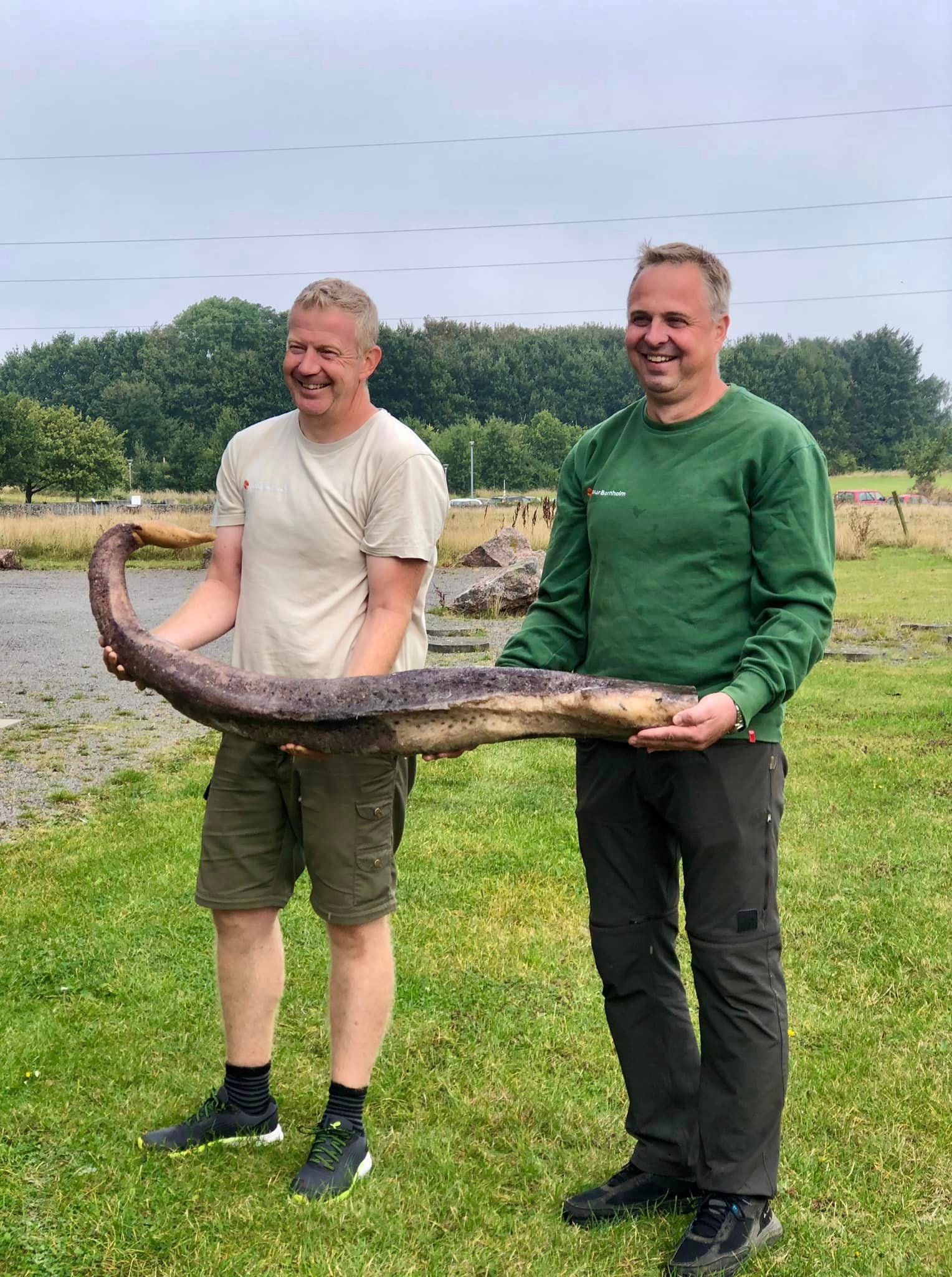 Er wurde in der Nähe von Snogebæk im Südosten der Insel gefunden und gehört aller Voraussicht nach einem verendeten Buckelwal, der in diesem Sommer am Strand von Dueodde angespült worden war.