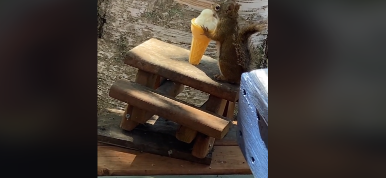 Doch was sie dort neben sich entdeckte, raubte ihr den Atem. An einem winzigen Picknick-Tisch saß ein niedliches Nagetier und genoss genüsslich eine winzige Eistüte.