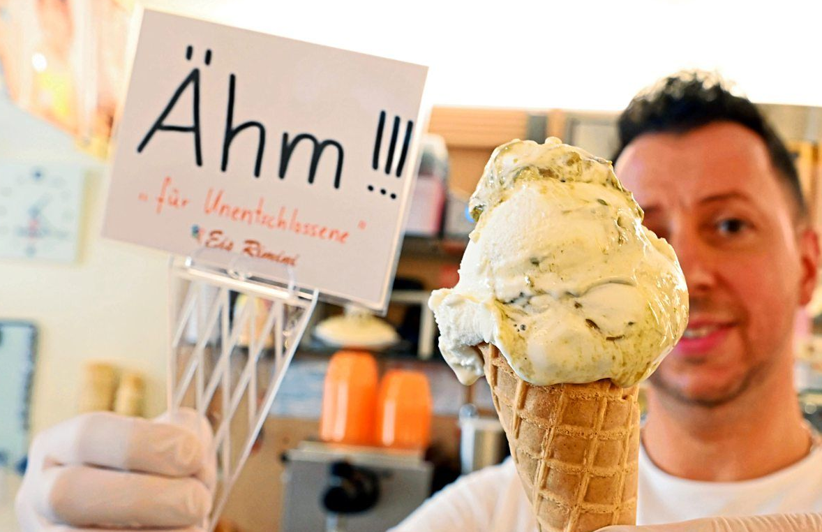 Wer an der Theke nicht genau weiß, was er will, und in dem Eissalon Rimini in Gaggenau in Baden-Württemberg seine Bestellung mit "Ähm" beginnt, bekommt womöglich ein "Ähm"-Eis in Waffel oder Becher geschaufelt. Die Kreation für Unentschlossene sorge gerade für einige Begeisterung in sozialen Netzwerken und für viel Zuspruch der Kunden, erzählt Alessandro Cimino, der das Eiscafé in der Stadt im Landkreis Rastatt besitzt.
