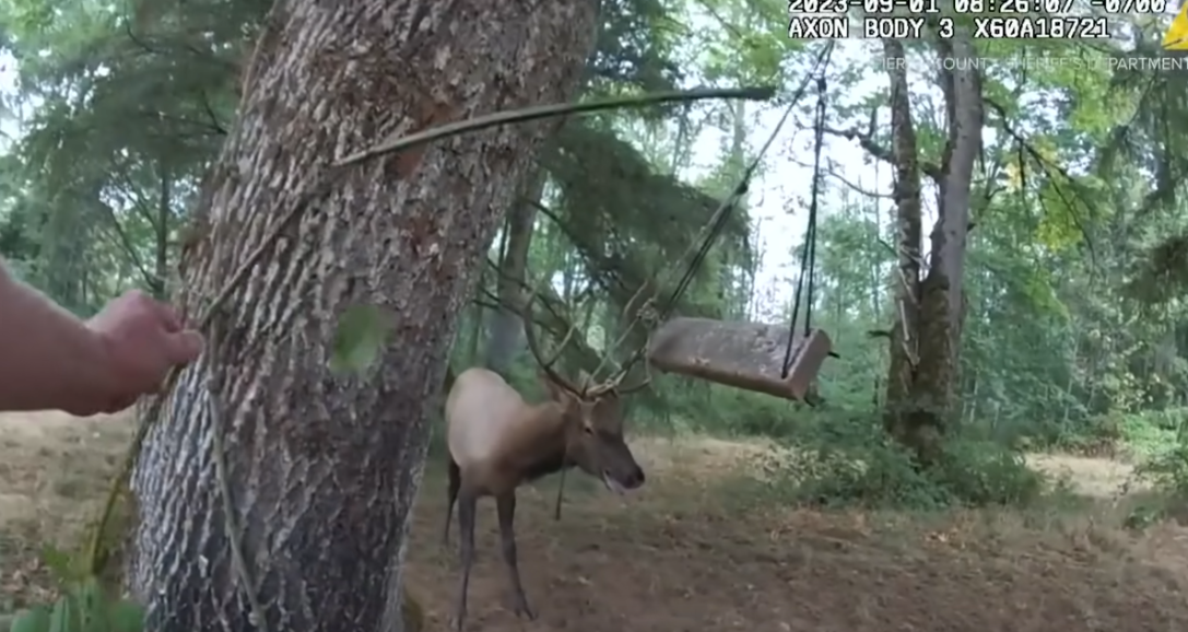 Anfang September wurden Polizisten aus Pierce County gerufen, um einen jungen Elchbullen zu retten, der sich mit seinem Geweih im Seil einer Baumschaukel verfangen hatte. Das Video ihrer Körperkamera zeigt, wie sie sich dem bockenden und in Panik geratenen Tier nähern und dann mit geliehenen Gartengeräten die Seile der Schaukel durchschneiden.
