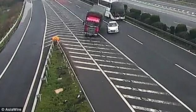 Der Vorfall ereignete sich auf der Schnellstraße G25 Changchun-Shenzhen bei Huzhou in der Provinz Zhejiang. Kisten mit Obst fielen von dem roten Lastwagen, der auf den Standstreifen kippte, nachdem der Fahrer versucht hatte, das Fahrzeug nach einem wilden Ausweichmanöver wieder auf Kurs zu bringen.