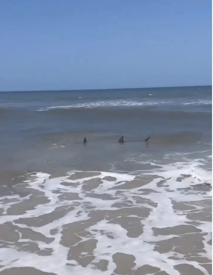 Zwei riesige Haie tauchen plötzlich im flachen Wasser vor der Küste Floridas auf. Die Aufnahmen entstanden am Neptune Beach in Jacksonville. Um welche Art von Haien es sich bei den beiden Exemplaren handelt, ist noch nicht klar.