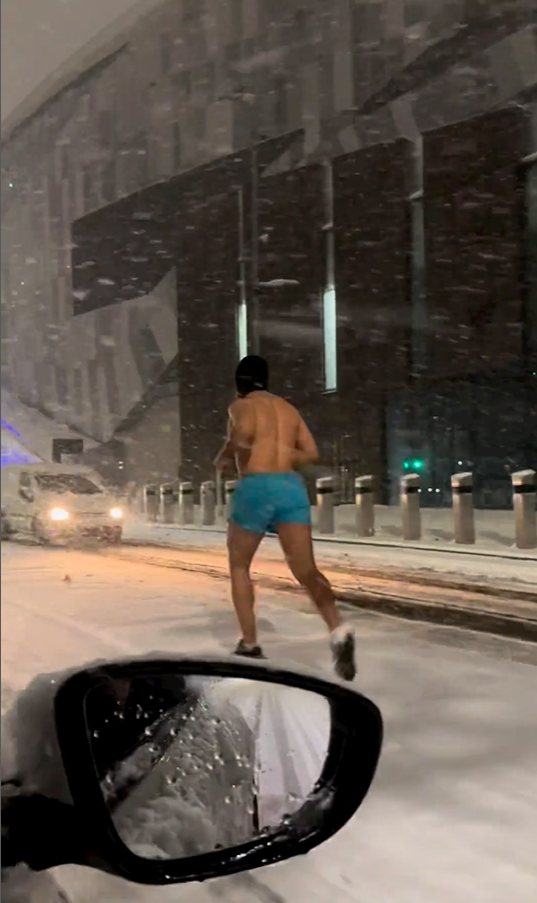 Der Personal Trainer und Unternehmer Yusef Bouattoura war am Sonntagabend bei starkem Schneefall in der Nähe des Tottenham Hotspur Stadiums an der White Hart Lane unterwegs. Trotz der eisigen Temperaturen trug Bouattoura nur ein Paar hellblaue Shorts und seine Laufschuhe. Er wird aus einem fahrenden Auto gefilmt, wie er in der Mitte der Straße am Stadion vorbeiläuft, während schneebedeckte Autos in der Gegenrichtung an ihm vorbeifahren.