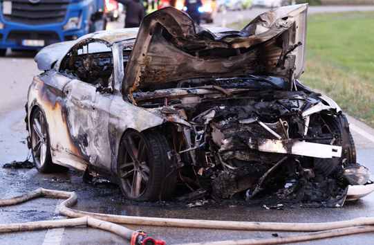 Der Autofahrer erlitt nur leichte Verletzungen, aber sowohl sein Fahrzeug als auch die KTM-Maschine des Motorradfahrers gerieten in Brand und mussten von der Feuerwehr gelöscht werden.
