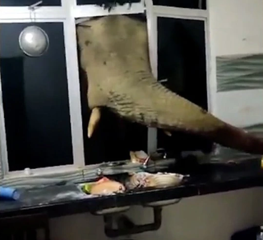 Die Bewohner des Hauses wurden durch den Lärm wachgerüttelt und rannten nach unten, um die Begegnung zu filmen. Die Aufnahmen zeigen, wie der Elefant seinen Rüssel benutzt, um das auf dem Spülbecken abgestellte Geschirr zu durchwühlen.