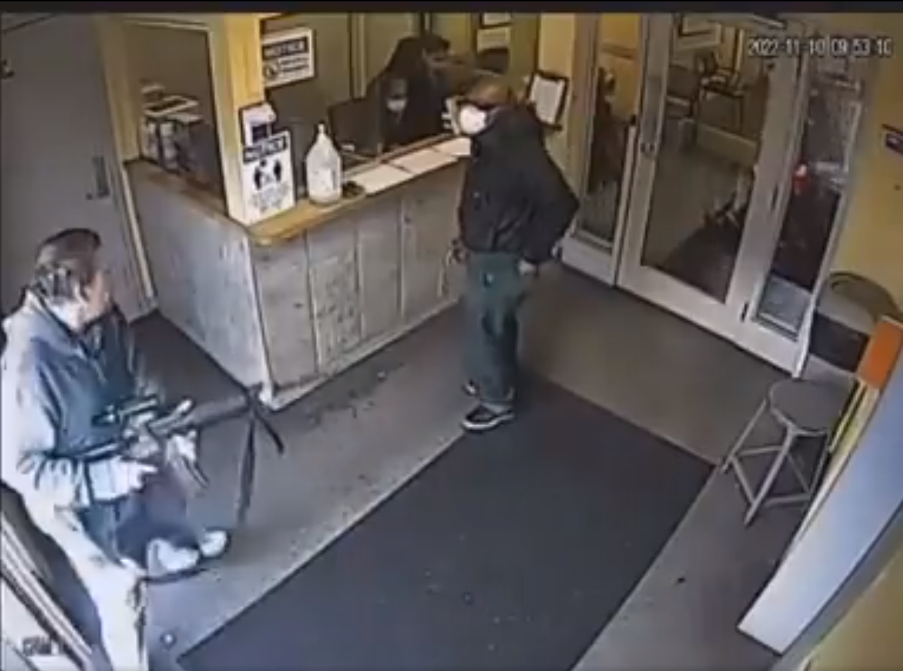 Im Überwachungsvideo sieht man, wie ein bewaffneter Mann in das Foyer einer Drogenklinik geht und plötzlich einen Schuss gegen die Wand abgibt. In dem Raum befand sich eine weitere Person, der zunächst flüchten wollte, sich dann aber umentschied und auf den Waffenträger losging. Er hielt ihn mit Mühe fest und redete auf ihn ein. Schließlich gelang es ihm, den Mann nach draußen zu zerren. Dort kamen weitere Personen zur Hilfe und sie konnten den Täter am Boden fixieren.
