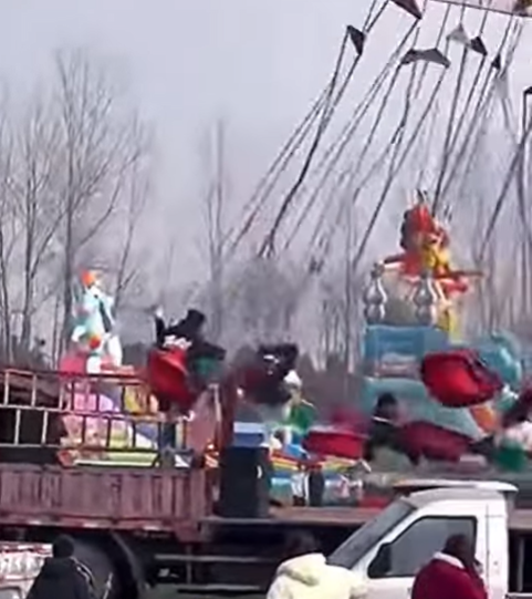 Touristen, die in Zentralchina auf einer Schaukel unterwegs waren, wurden in einen in der Nähe geparkten Lastwagen geschleudert. Das Video wurde in der Stadt Zhoukou in der Provinz Henan aufgenommen.