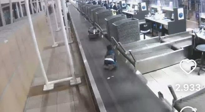 Im Video ist zu sehen, wie der kleine Abenteurer zwischen Koffern über verschiedene Gepäckbänder fährt und neugierig die Umgebung erkundet. Sobald die Flughafenmitarbeiter das Kind entdeckten, stoppten sie die Förderbänder, traten aus dem Bild und kehrten mit dem Jungen im Arm zurück, bevor ihm etwas passieren konnte.