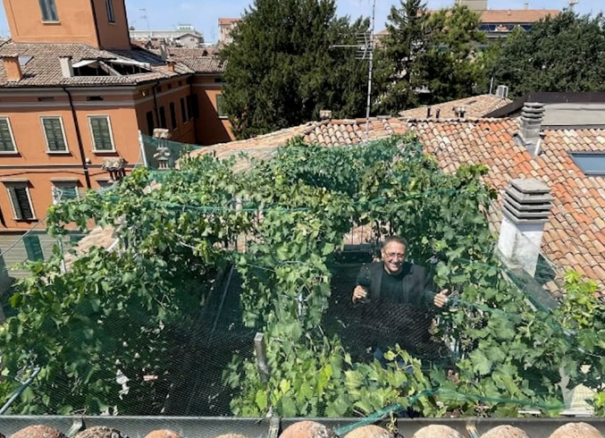 Ein Winzer namens Tullio Masoni betreibt einen Weinberg auf dem Dach eines Gebäudes in der Emilia Romagna, Italien. Die Preise sind nicht allzu günstig.